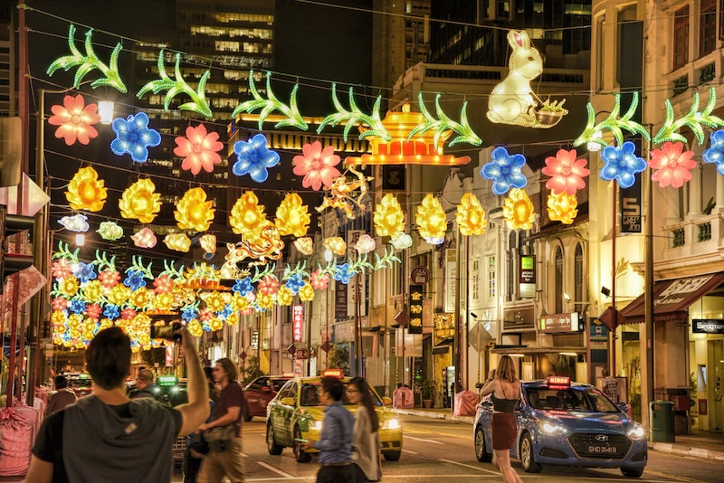 Hanging lanterns at the annual street light-up in Chinatown as part of the Mid-Autumn Festival celebrations. They are along South Bridge Road, which runs parallel to New Bridge Road and Eu Tong Sen Street.