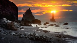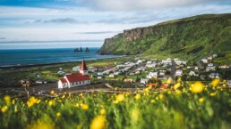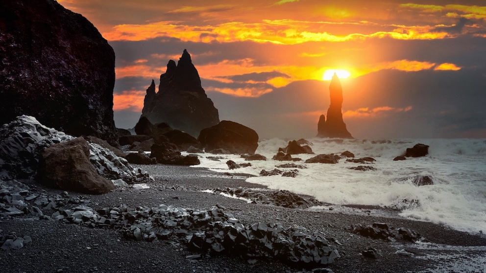 Excursión a la Costa Sur. Paradas en la Playa de arena negra Reynisfjara, el pueblo de Vík, las cascadas Skógafoss y Seljalandsfoss, con posibilidad de caminar detrás de esta última para disfrutar de vistas únicas.